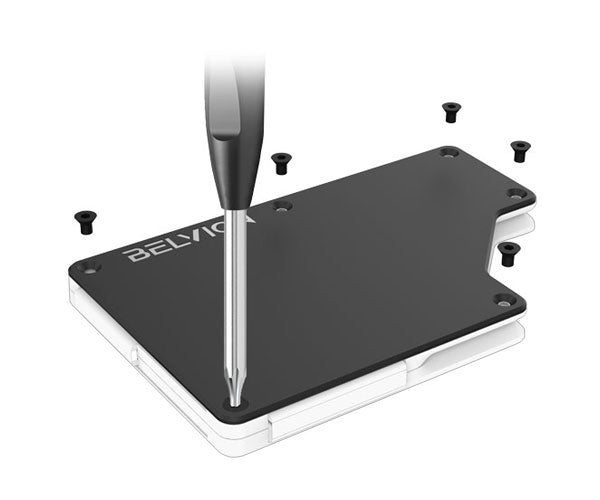 Use the hex screwdriver that you received it the box with your Belvion wallet and unscrew all the bolts from the front and back plate of the wallet to get accesses to both adjustment plates.